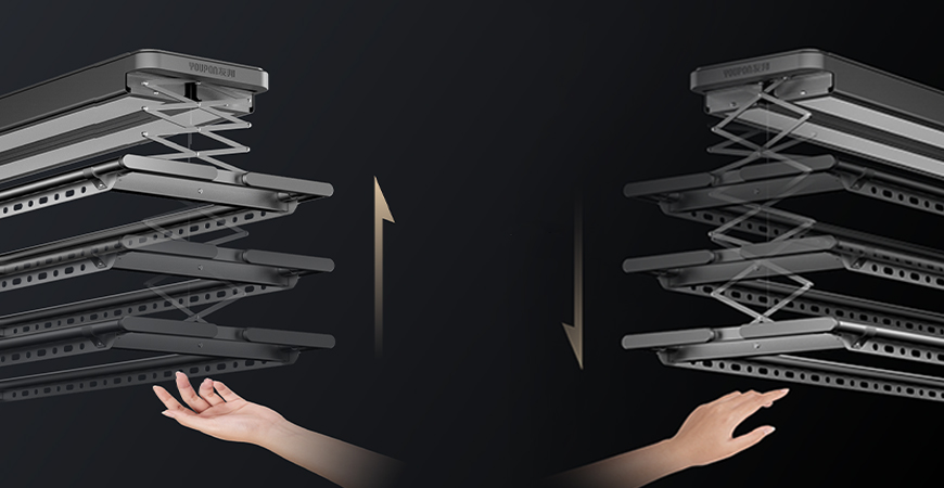 晾衣架下降至底部,輕抬托架即可觸發(fā)上升,方便省事;且晾衣架上升/下降過程中遇到障礙物會自動回升,保護使用者安全。